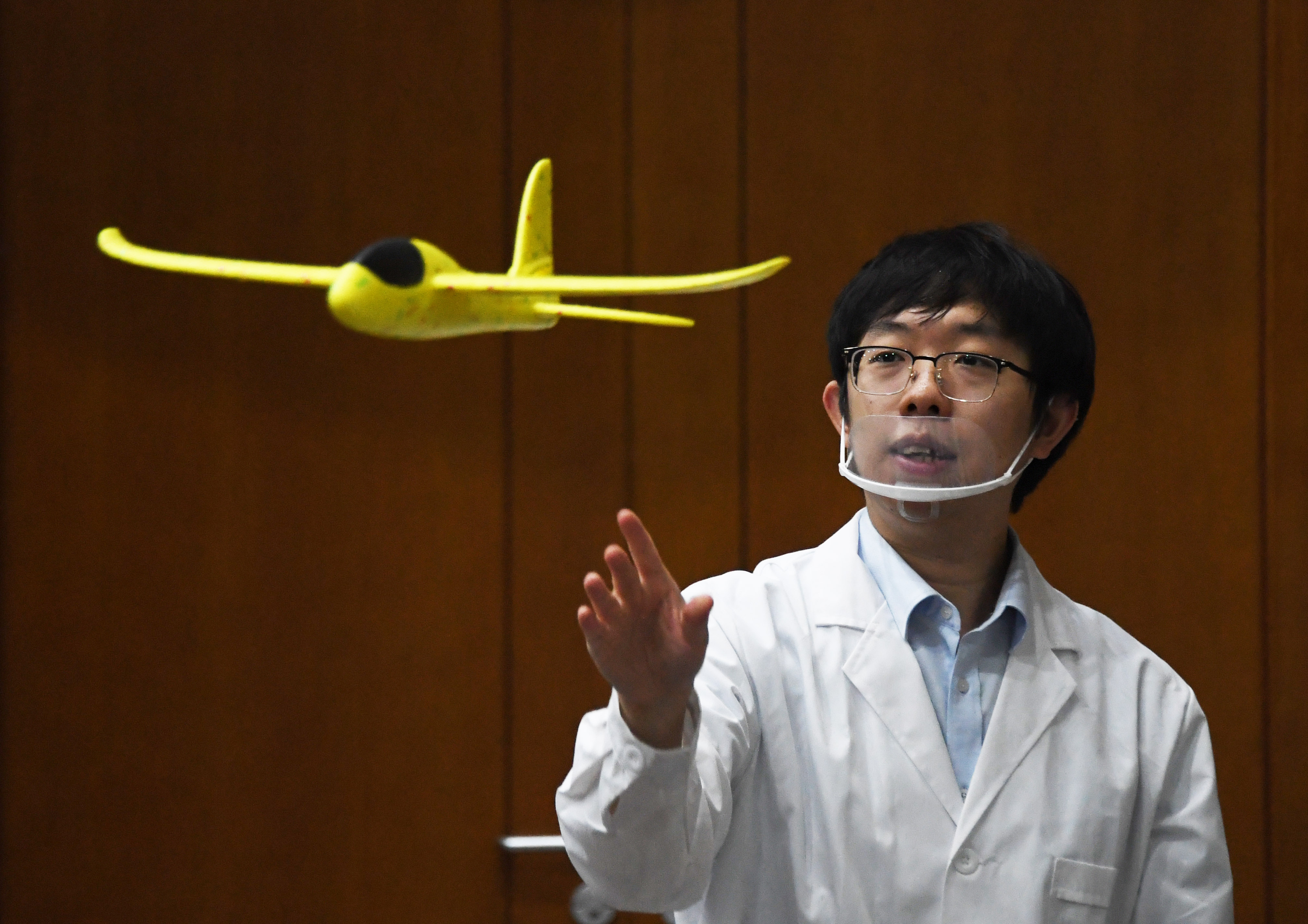 5月30日,工作人员(右一)在“玩转汽车”科普秀中通过飞机模型介绍伯努利原理。