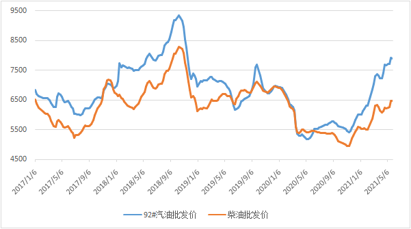图表:中国汽柴油批发价格周度均价走势(单位:元/吨)