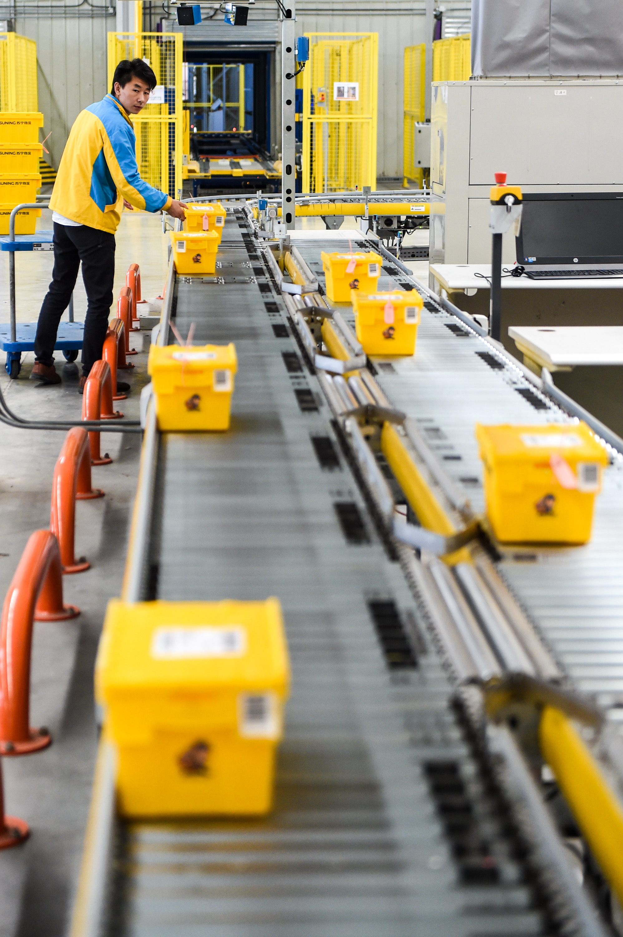 物流基地里工作人员将包装好的“共享快递盒”放到传送带上 新华社记者 李博 摄