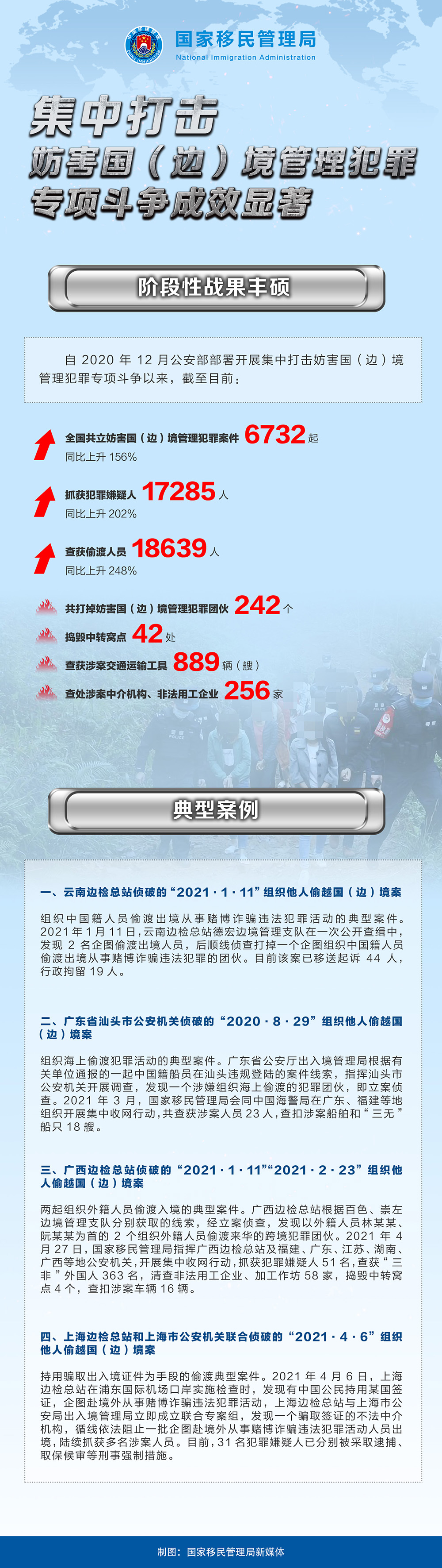 为严厉打击跨境违法犯罪,维护正常出入境秩序,2020年12月,公安部在全国范围部署开展集中打击妨害国(边)境管理犯罪专项斗争。国家移民管理局通过加强出入境证件签发、口岸出入境检查、边境地区防控查堵,推动重点地区、行业、领域源头治理,创新技战法,严厉打击组织外籍人员非法入境从事违法犯罪活动,严厉打击组织中国籍人员非法出境从事赌博诈骗等违法犯罪活动,成功侦办了一批重大案件,打掉一批跨国跨境偷渡犯罪团伙,依法严惩了一批中外籍偷渡组织者、运送者和引带人员,有力打击妨害国(边)境管理违法犯罪活动,维护国家安全和社会大局稳定。