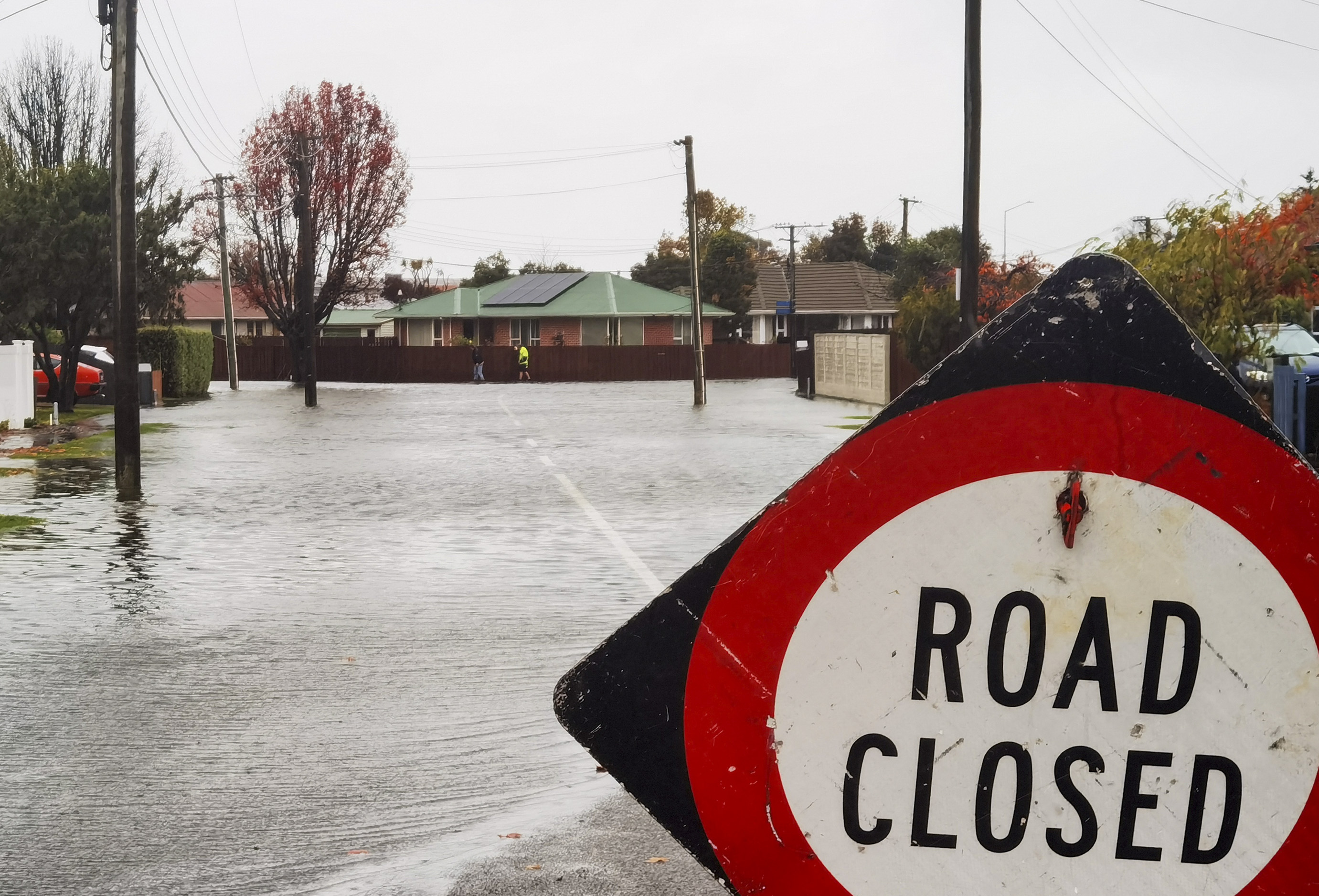5月30日,新西兰克赖斯特彻奇因强降雨封闭部分道路。(新华社发,仲伟人摄)