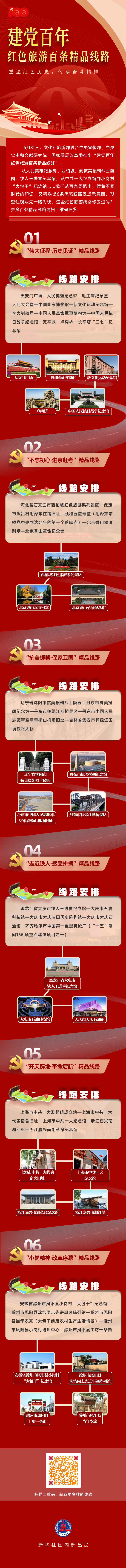5月31日,文化和旅游部联合中央宣传部、中央党史和文献研究院、国家发展改革委推出“建党百年红色旅游百条精品线路”。