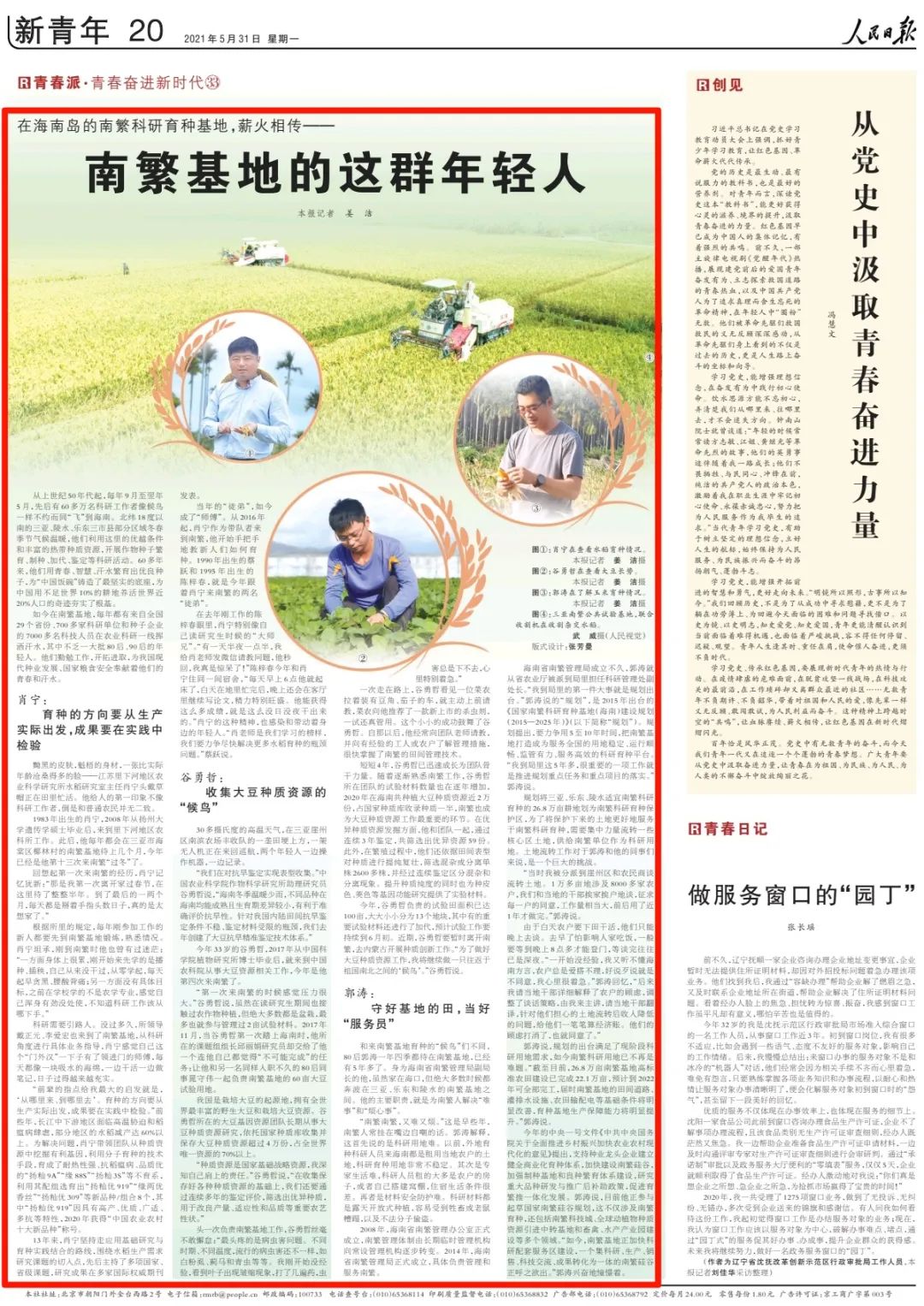 如今在南繁基地,每年都有来自全国29个省份、700多家科研单位和种子企业的7000多名科技人员在农业科研一线挥洒汗水,其中不乏一大批80后、90后的年轻人。他们勤勉工作,开拓进取,为我国现代种业发展、国家粮食安全奉献着他们的青春和汗水。