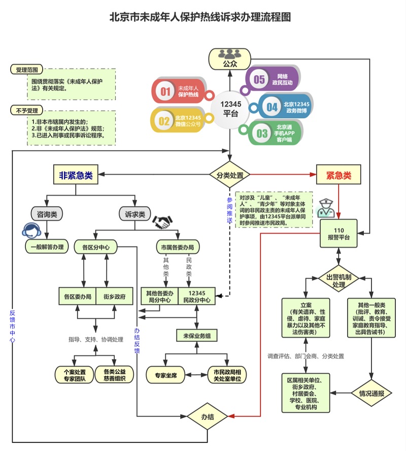 未成年人是国家的未来、民族的希望、家庭的梦想。保护未成年人,就是保护我们的未来,呵护家庭的梦想。中共北京市委社会工委市民政局和北京市政务局、北京市12345市民热线服务中心,合作建立了12345北京市未成年人保护热线。从6月1日起正式开通并投入使用。热线主要受理未成年人保护政策法规咨询服务;心理疏导、情绪抚慰等服务;个案帮扶与转介服务;未成年人生活困难求助受理;侵害未成年人权益事件线索;其他涉及未成年人救助保护情形。