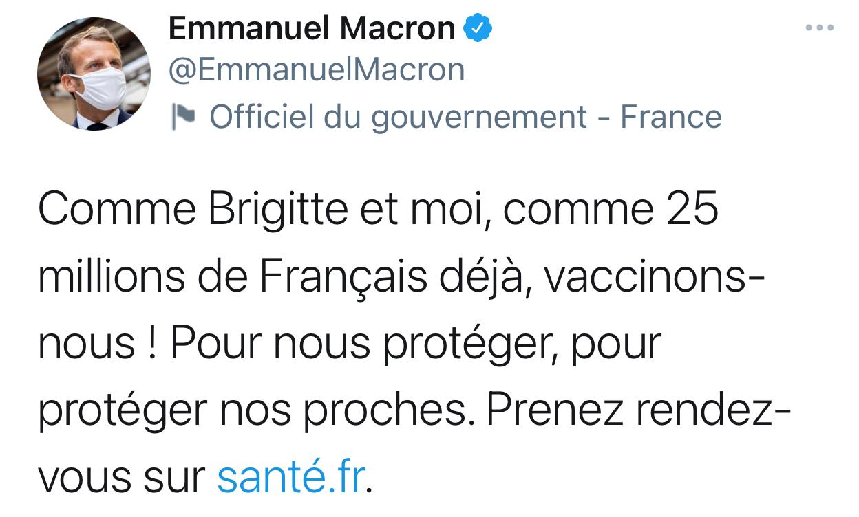 △法国总统马克龙在社交媒体上宣布他和夫人接种第一剂新冠疫苗