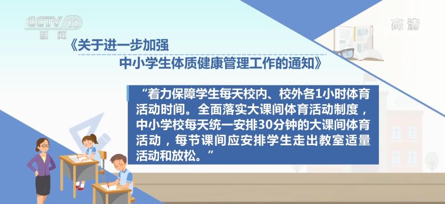 而《关于进一步加强中小学生体质健康管理工作的通知》中,则进一步强调“着力保障学生每天校内、校外各1小时体育活动时间。全面落实大课间体育活动制度,中小学校每天统一安排30分钟的大课间体育活动,每节课间应安排学生走出教室适量活动和放松。”