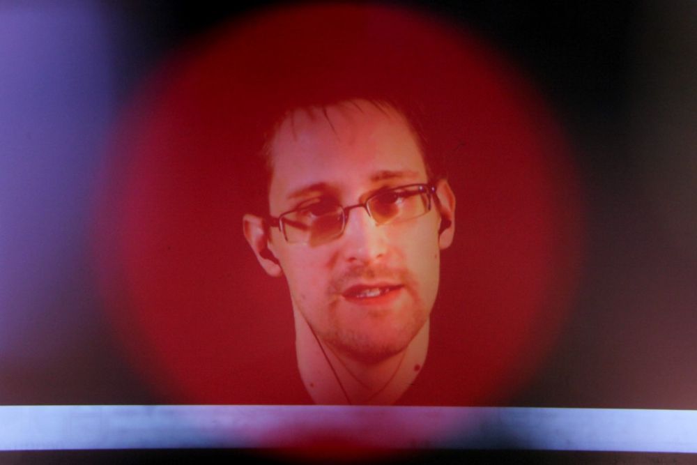 2015年3月18日,在德国汉诺威,大屏幕上显示斯诺登接受采访的画面。(新华社记者张帆摄)