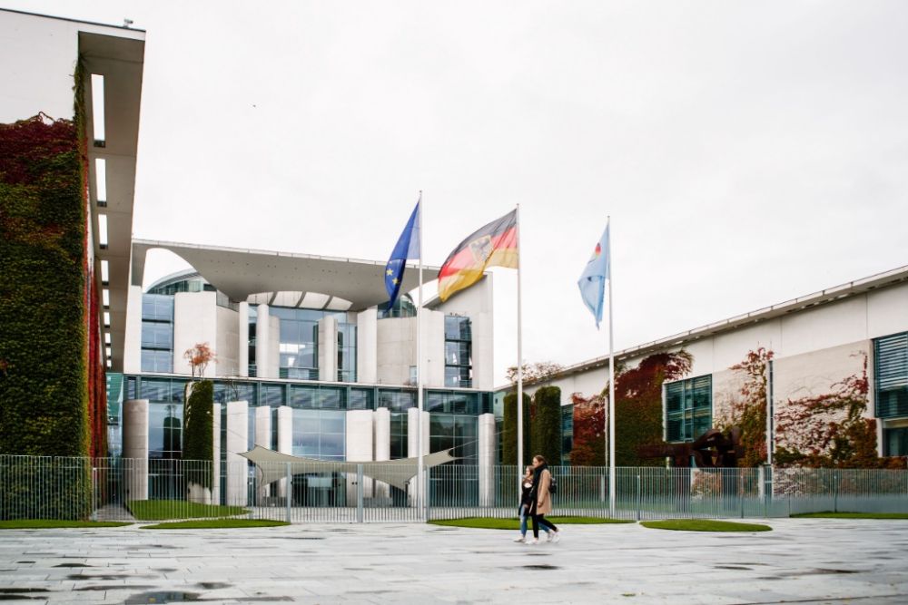 2020年10月15日,在德国首都柏林,行人经过总理府。(新华社发)