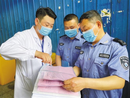 5月13日,西安市生态环境保护综合执法支队走进西安市红会医院开展医疗垃圾执法检查。图为执法人员检查管理台账。