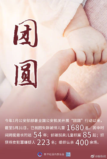 【权威快报|#团圆行动找回失踪被拐儿童1680名#】记者从1日召开的公安部新闻发布会获悉,今年1月公安部部署全国公安机关开展“团圆”行动以来,已找回失踪被拐儿童1680名,其中时间跨度最长的达54年;侦破拐卖儿童积案85起;抓获拐卖犯罪嫌疑人223名;组织认亲400余场。孩子,天涯海角也要找到你!(记者白阳、熊丰,海报设计贾伊宁)