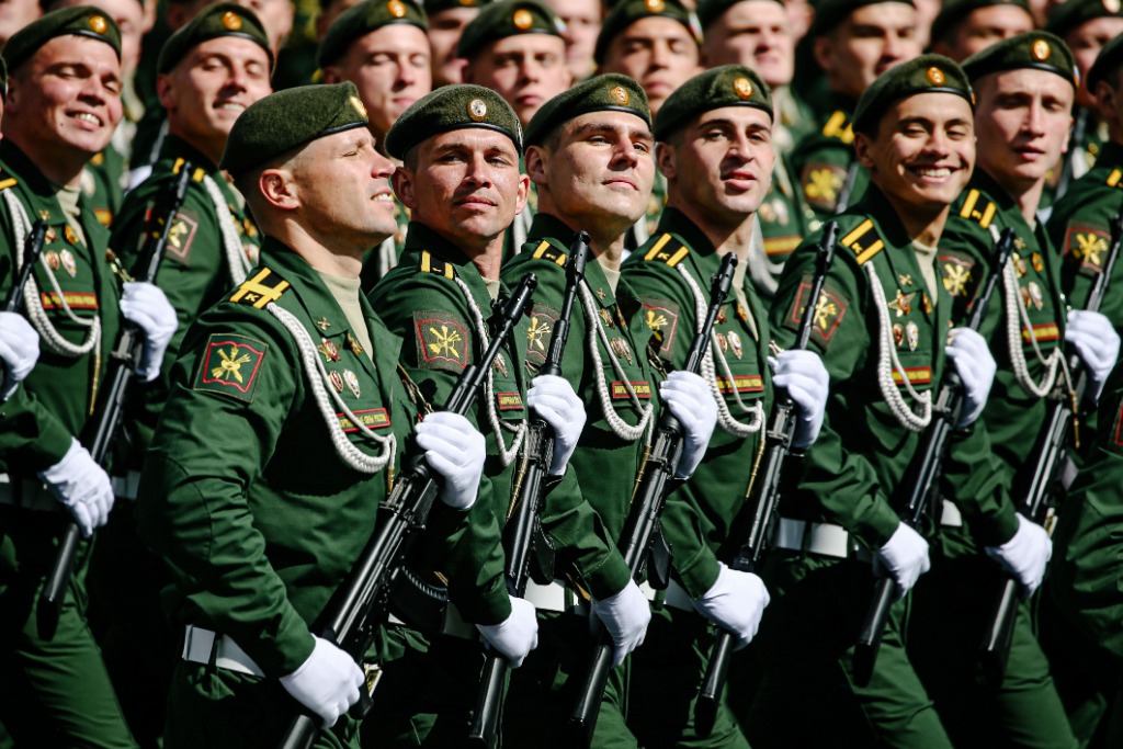 5月7日,俄罗斯士兵在莫斯科参加胜利日阅兵彩排。(新华社发,叶甫盖尼·西尼岑摄)
