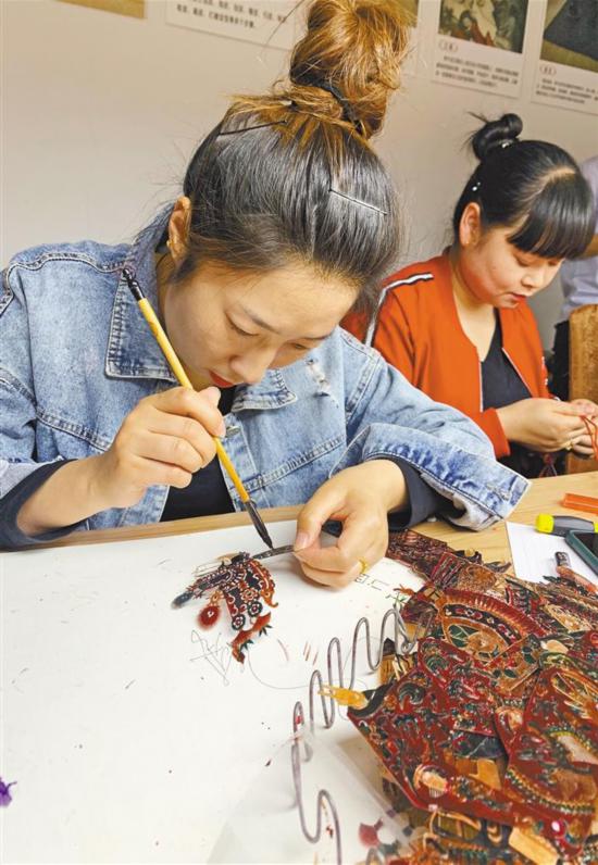 然而,这小小的皮影,制作起来却并不容易。走进皮影制作工坊,只见十几名皮影制作艺人神情专注地各自忙碌着。在这里,一块块精挑细选的牛皮经过制皮、过稿、雕刻、敷彩、缀结、装签等30多道工序后“重获新生”,构成了一个个文臣武将、才子佳人的生动形象。