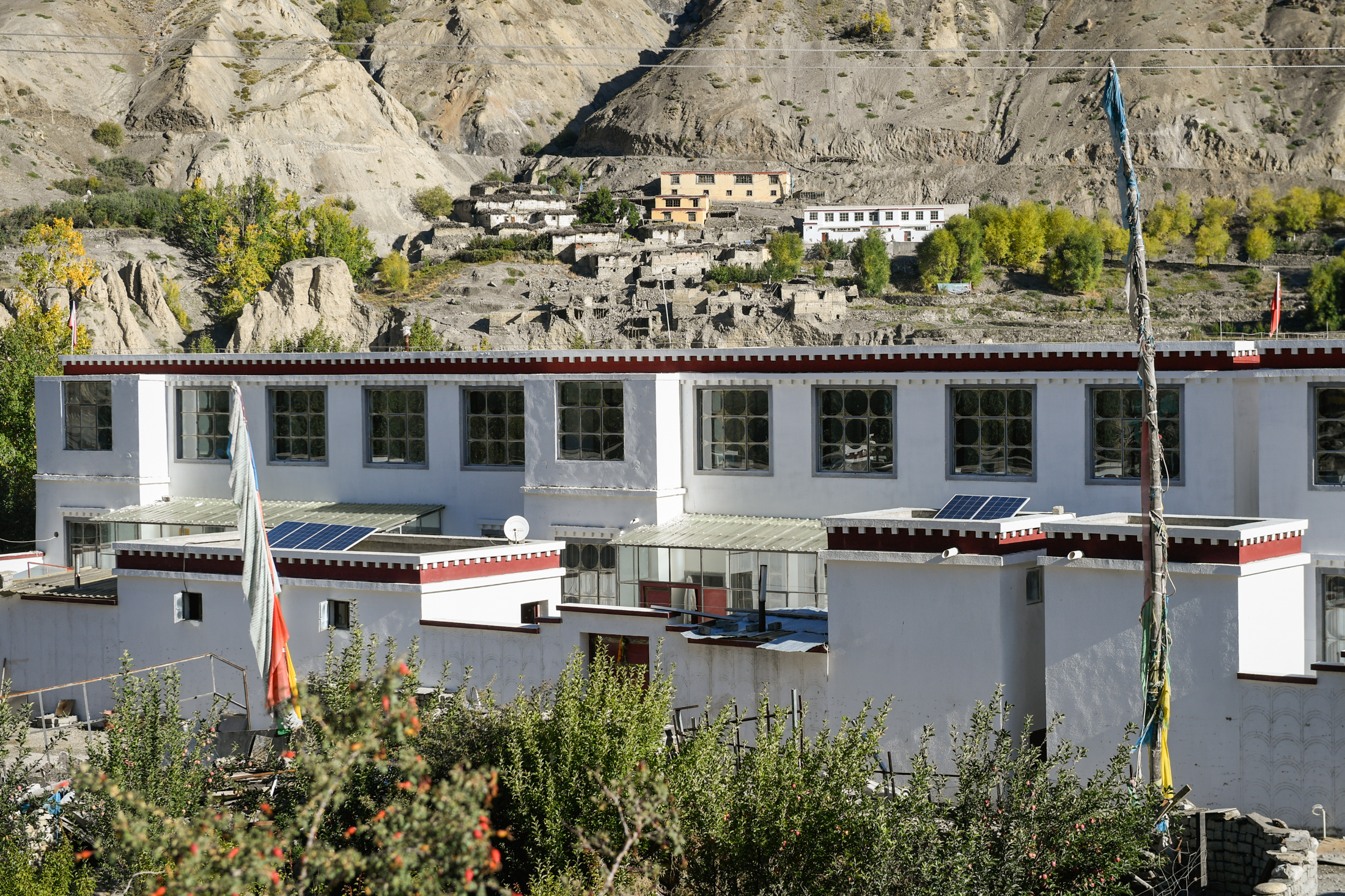 阿里地区札达县楚鲁松杰乡楚松村村民欧珠加措的新房,即“第四代”房,红白相间的藏式小院排列成行(2018年9月16日摄)。新华社发(刘东君 摄)