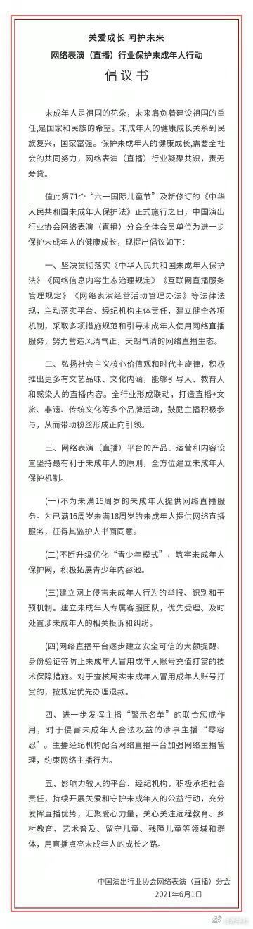 【不为未满16周岁未成年人提供网络直播服务】中国演出行业协会网络表演(直播)分会6月1日发出倡议,网络直播平台不为未满16周岁的未成年人提供网络直播服务,为已满16周岁未满18周岁的未成年人提供网络直播服务,征得其监护人书面同意;逐步建立安全可信的大额提醒、身份验证等防止未成年人冒用成年人账号充值打赏的技术保障措施。(记者白瀛)