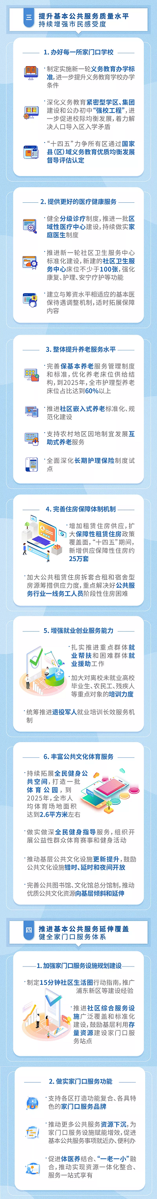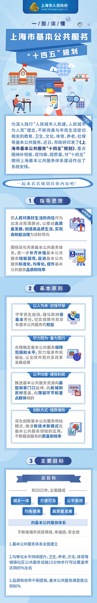 《规划》指出,上海基本公共服务在“十四五“期间的主要目标是到2025年,全面建成城乡一体、方便可及、公平高效、均衡普惠、高质量发展的基本公共服务体系,努力实现幼有善育、学有优教、劳有厚得、病有良医、老有颐养、住有宜居、弱有众扶的美好景象,不断增强市民获得感、幸福感、安全感。
