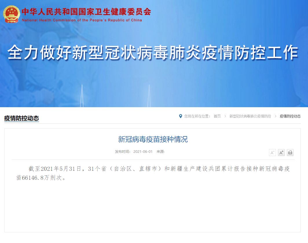 截至2021年5月31日,31个省(自治区、直辖市)和新疆生产建设兵团累计报告接种新冠病毒疫苗66146.8万剂次。(总台央视记者 史迎春)