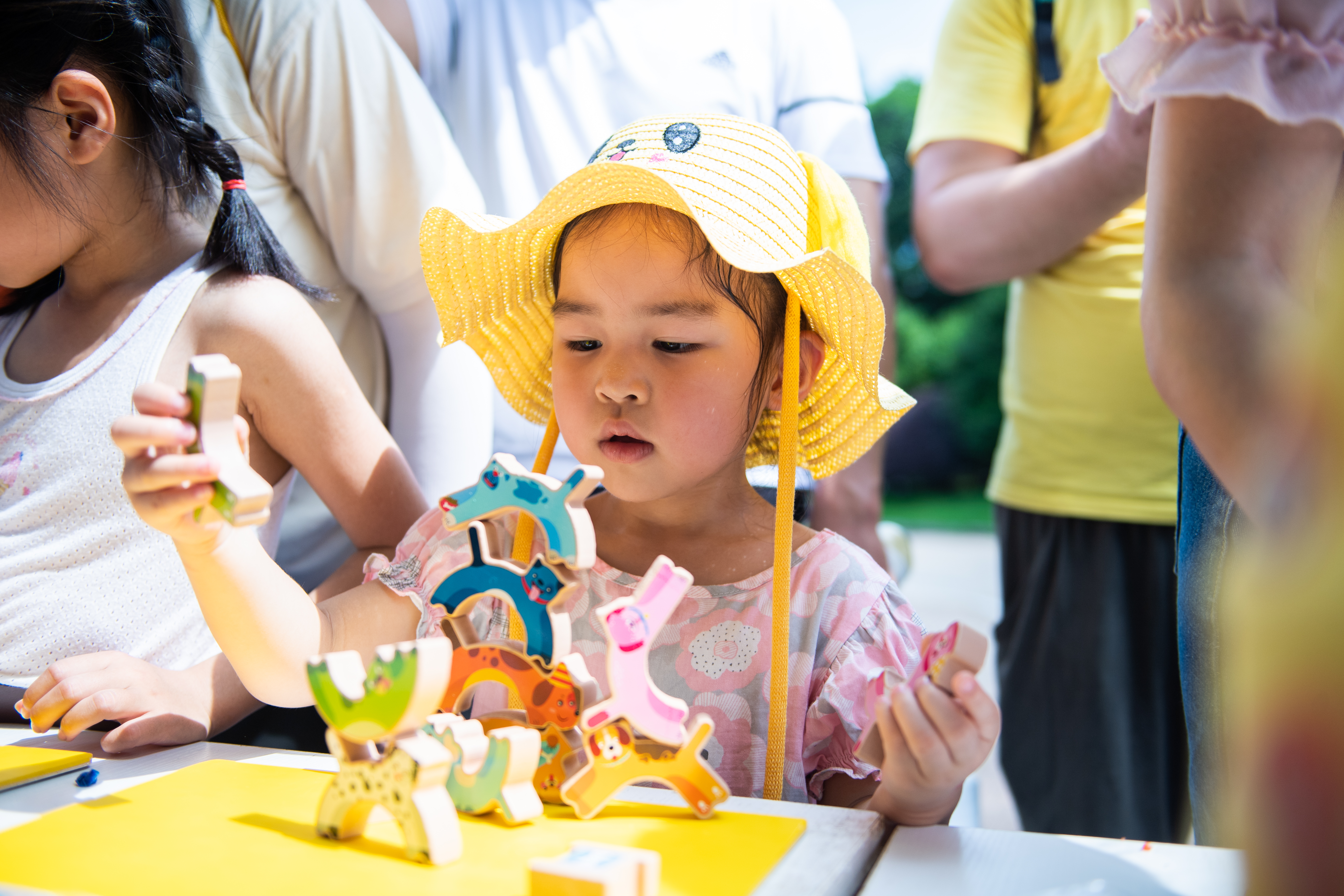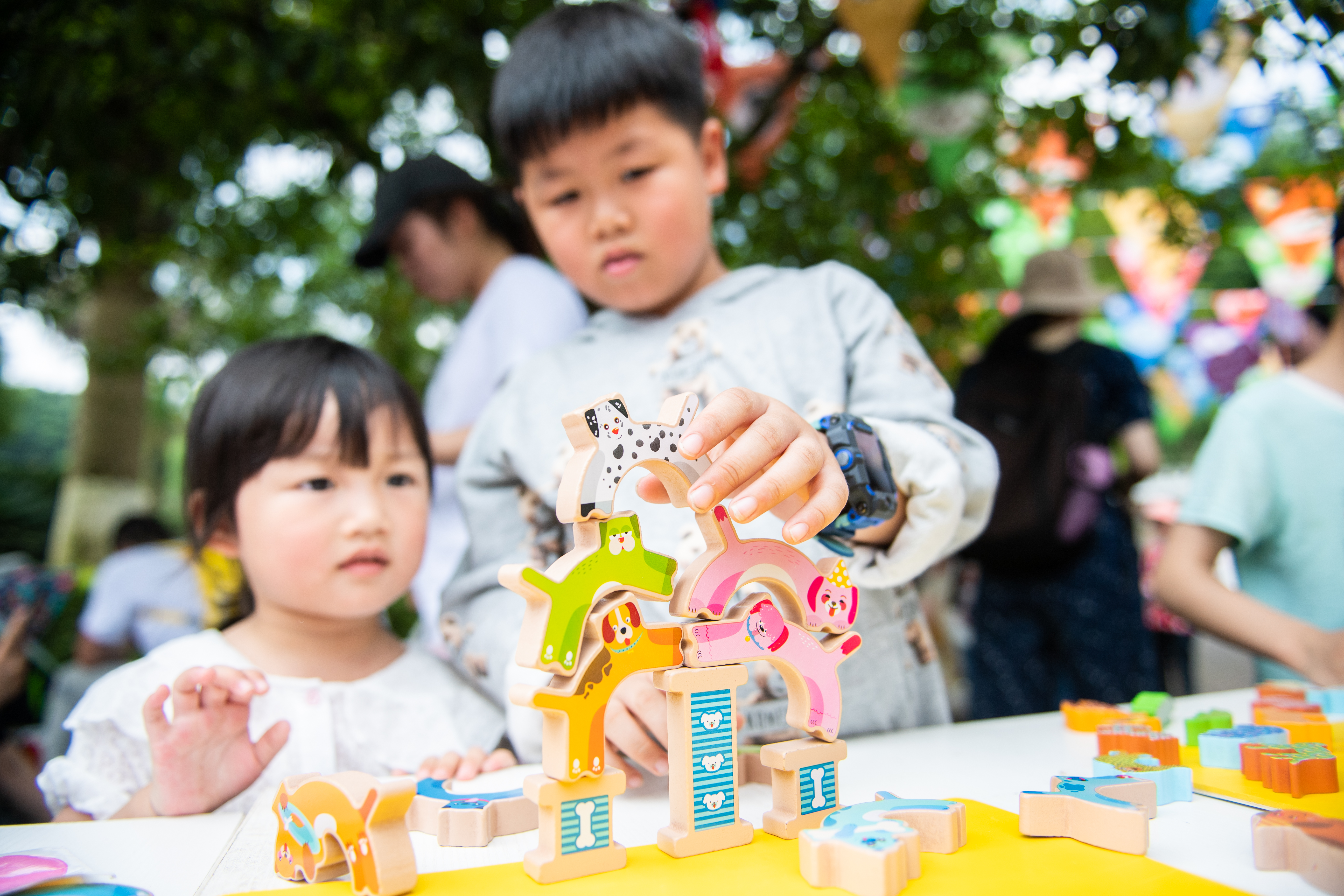 6月1日,在长沙生态动物园,小朋友在搭动物积木。