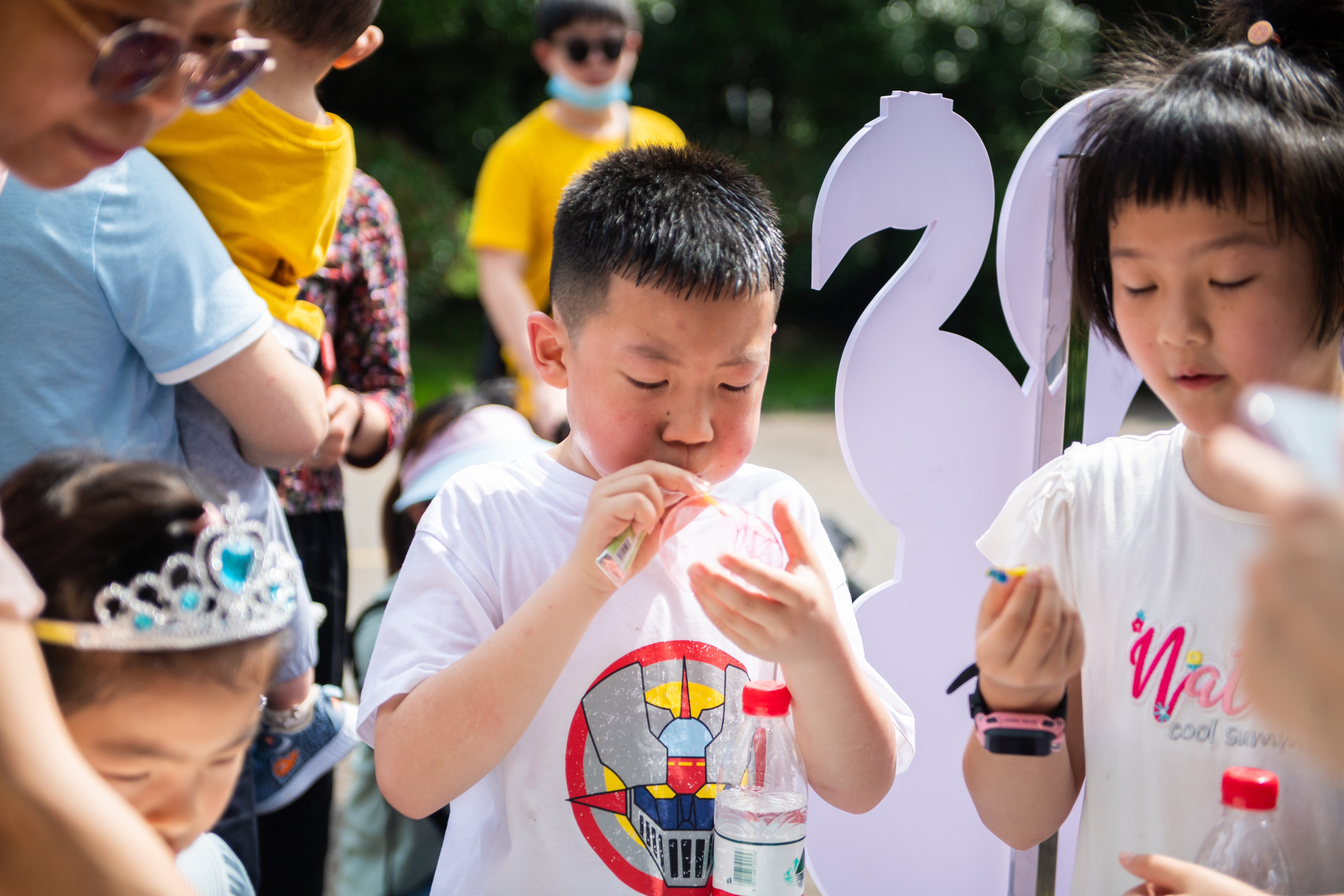 6月1日,在长沙生态动物园,小朋友参加吹泡泡游戏。