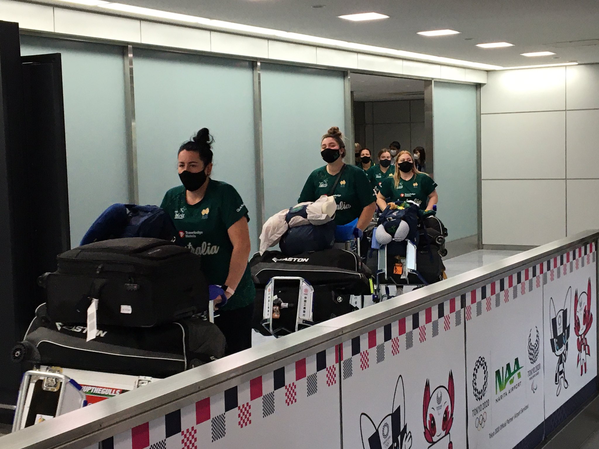澳大利亚垒球队由23名队员和10名随队人员组成,他们是从新加坡转机抵达东京的。全队身穿国家队队服、戴着口罩抵达机场,全体队员看上去都非常兴奋,对着前来拍摄的记者的镜头挥手,不过很快她们就被专人引导,进行了新冠肺炎病毒检测。