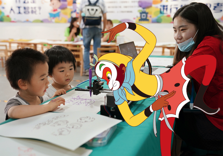 孩子们体验智能机器人绘画。(新华社记者刘颖摄、记者王婧媛后期制作,上海美术电影制片厂授权)