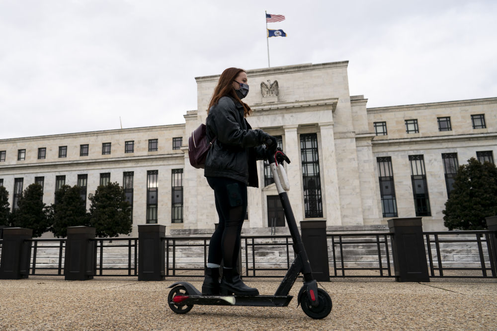 1月27日,在美国华盛顿,一名骑滑板车的女子从美联储大楼前经过。(新华社记者刘杰摄)