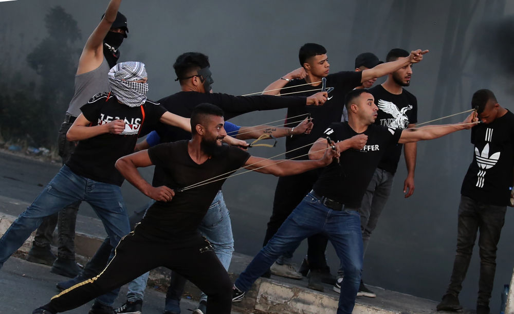 5月17日,巴勒斯坦抗议者在约旦河西岸城市纳布卢斯附近向以色列士兵投掷石块。(新华社发,尼达勒摄)