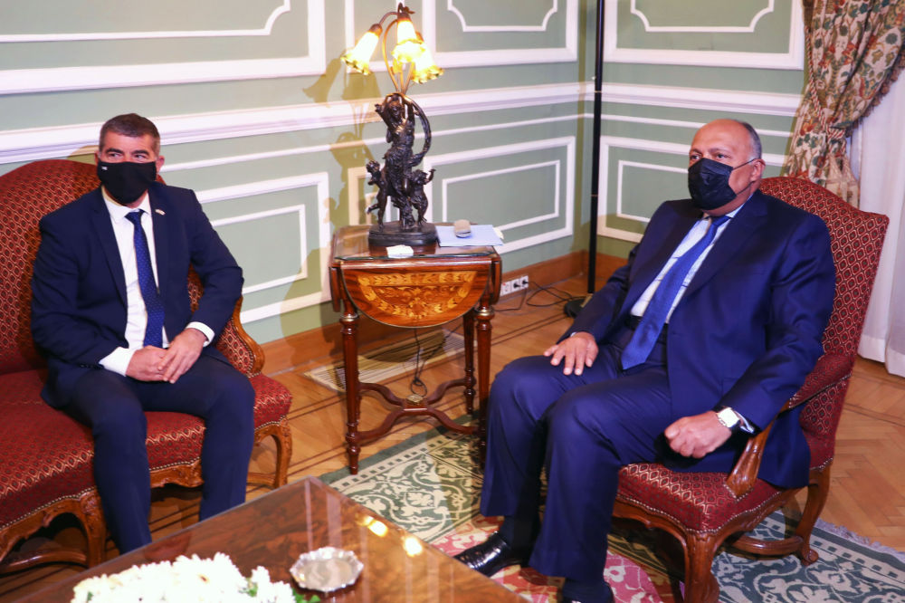 5月30日,在埃及首都开罗,埃及外交部长舒凯里(右)会见以色列外交部长阿什克纳齐,双方讨论了巩固巴以停火的措施,同意加强协调,以推动中东和平进程。(新华社发)