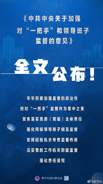 【#权威快报#丨《中共中央关于加强对“一把手”和领导班子监督的意见》全文公布!】6月1日,《中共中央关于加强对“一把手”和领导班子监督的意见》全文公布。意见具体包括7方面内容:牢牢把握加强监督的政治性;把对“一把手”监督作为重中之重;聚焦落实党委(党组)主体责任;强化同级领导班子相互监督;发挥纪检机关专责监督作用;压实党的工作机关职能监督;强化责任追究。(记者孙少龙,海报设计贾伊宁)
