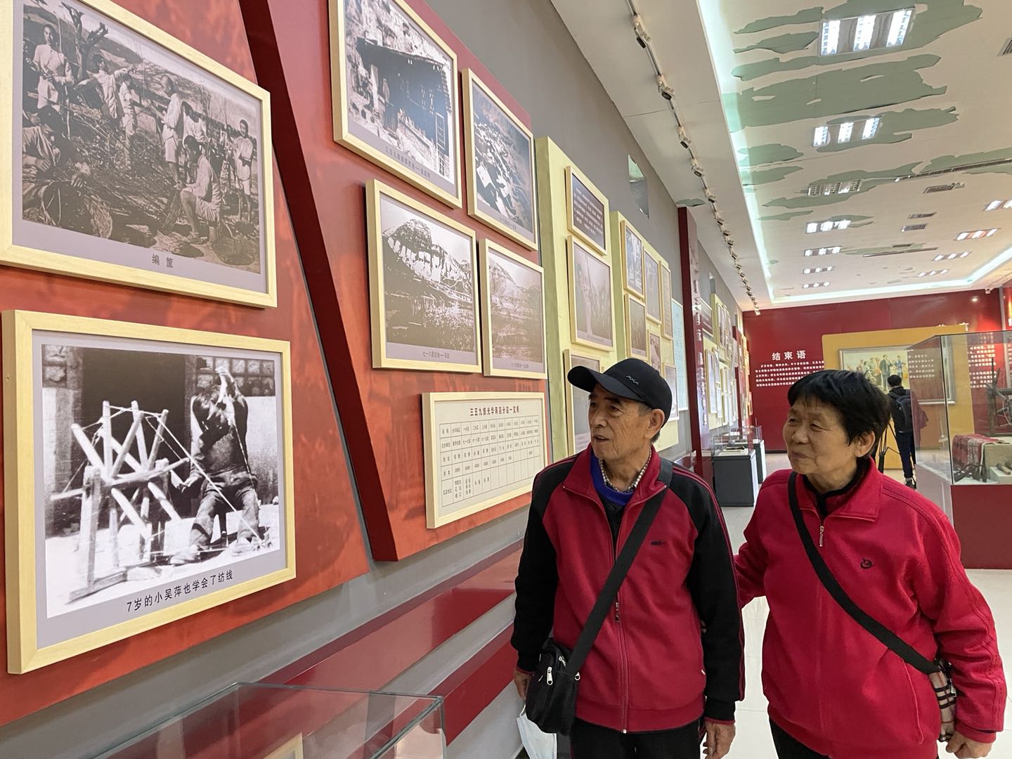 郭淑英(右)和老伴赵振在南泥湾大生产展览馆参观。(新华社记者张斌摄)