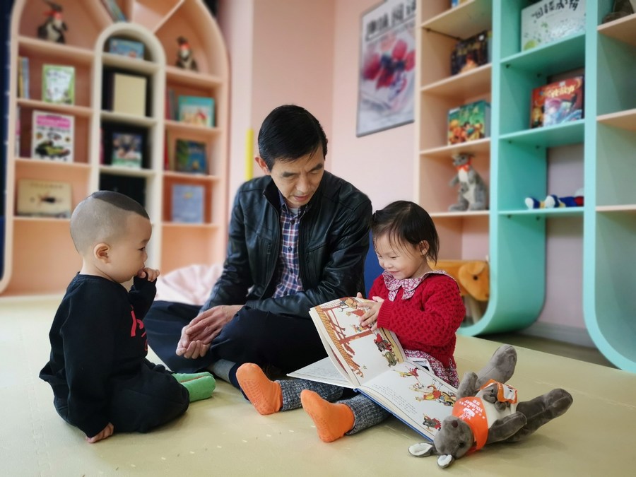 在四川天府新区一家绘本馆内,家长正给孩子读绘本《大闹天宫》。新华社记者 李倩薇 摄