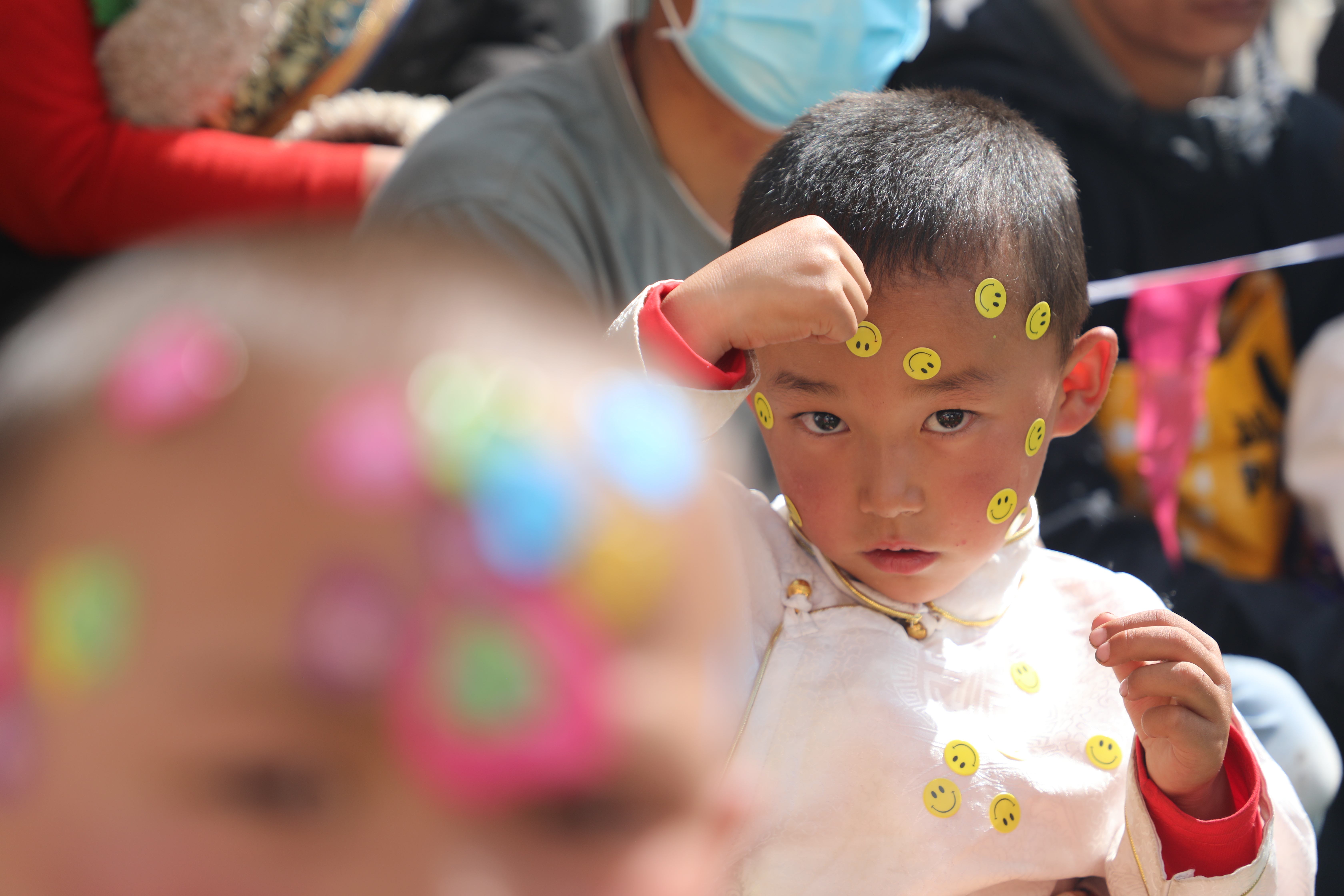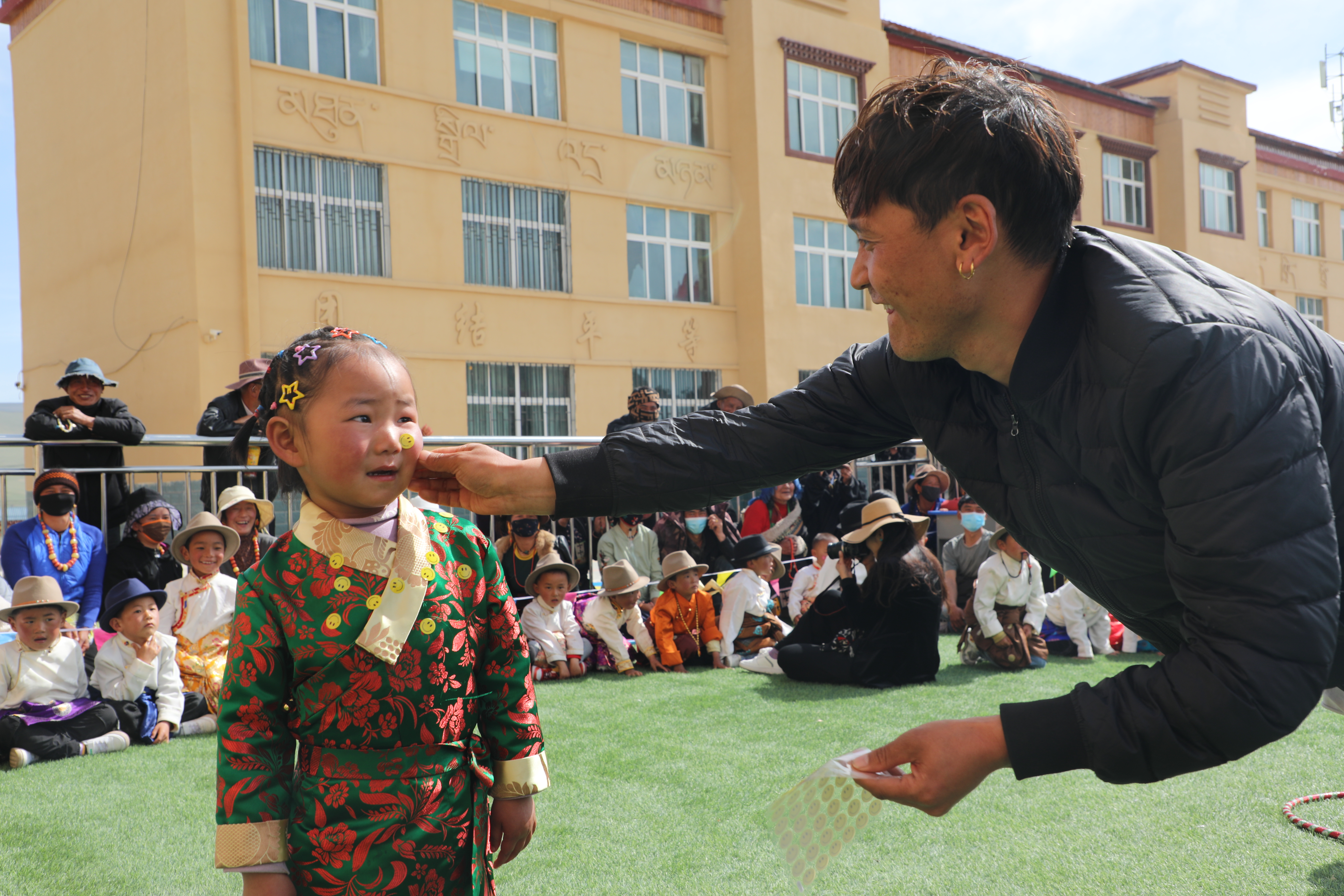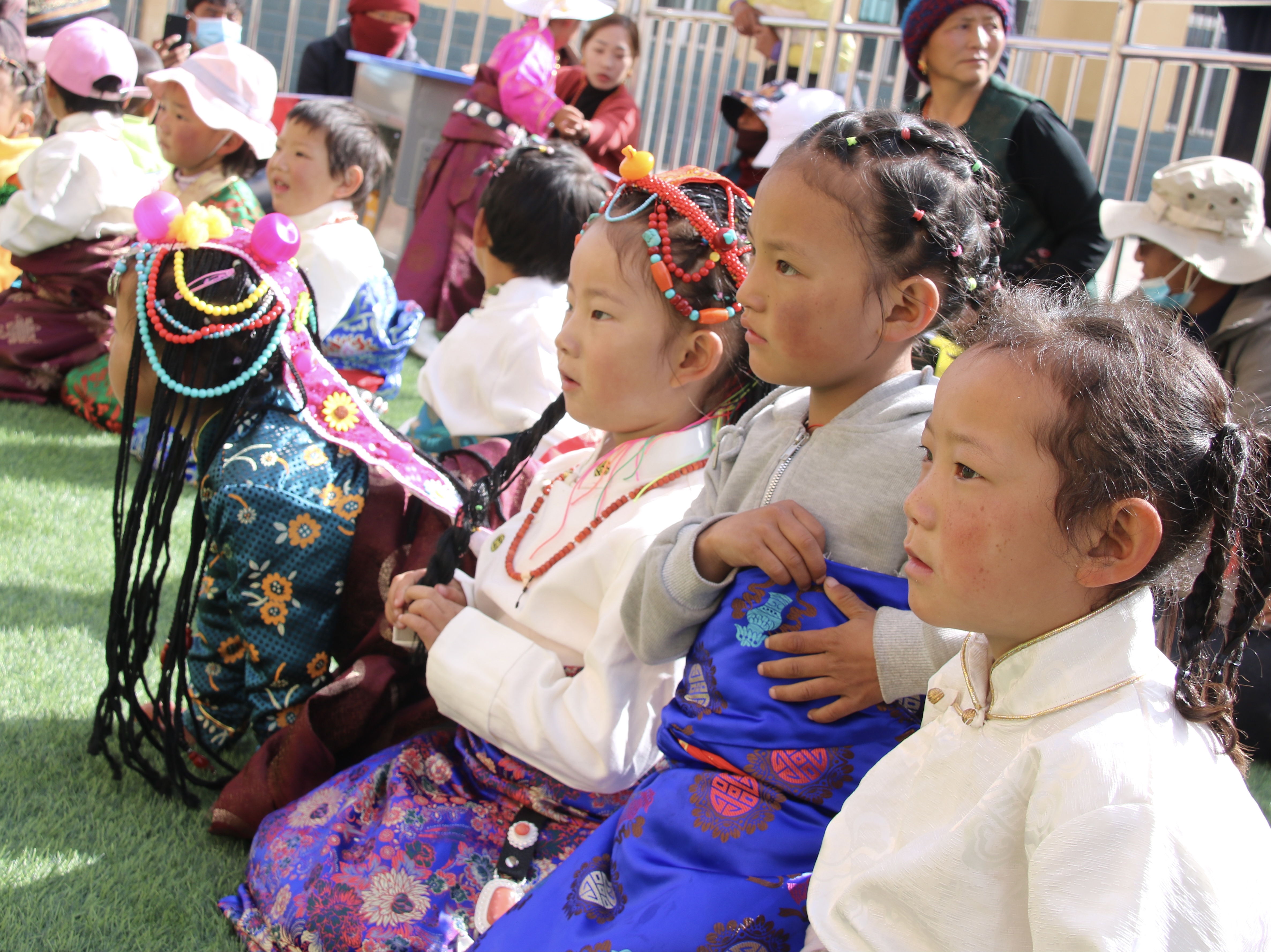 今年的“六一”活动上,贡巴幼儿园的小朋友们表演了藏族歌舞、《三字经》朗诵等精彩节目。小男孩们穿上藏袍、戴上毡帽,活泼地跳起锅庄。小女孩们盛装打扮,头上用彩色头绳编满了小辫儿,腰间特色银饰叮当作响。亲子互动游戏笑声不断,栏杆外的老阿妈看得兴致盎然。