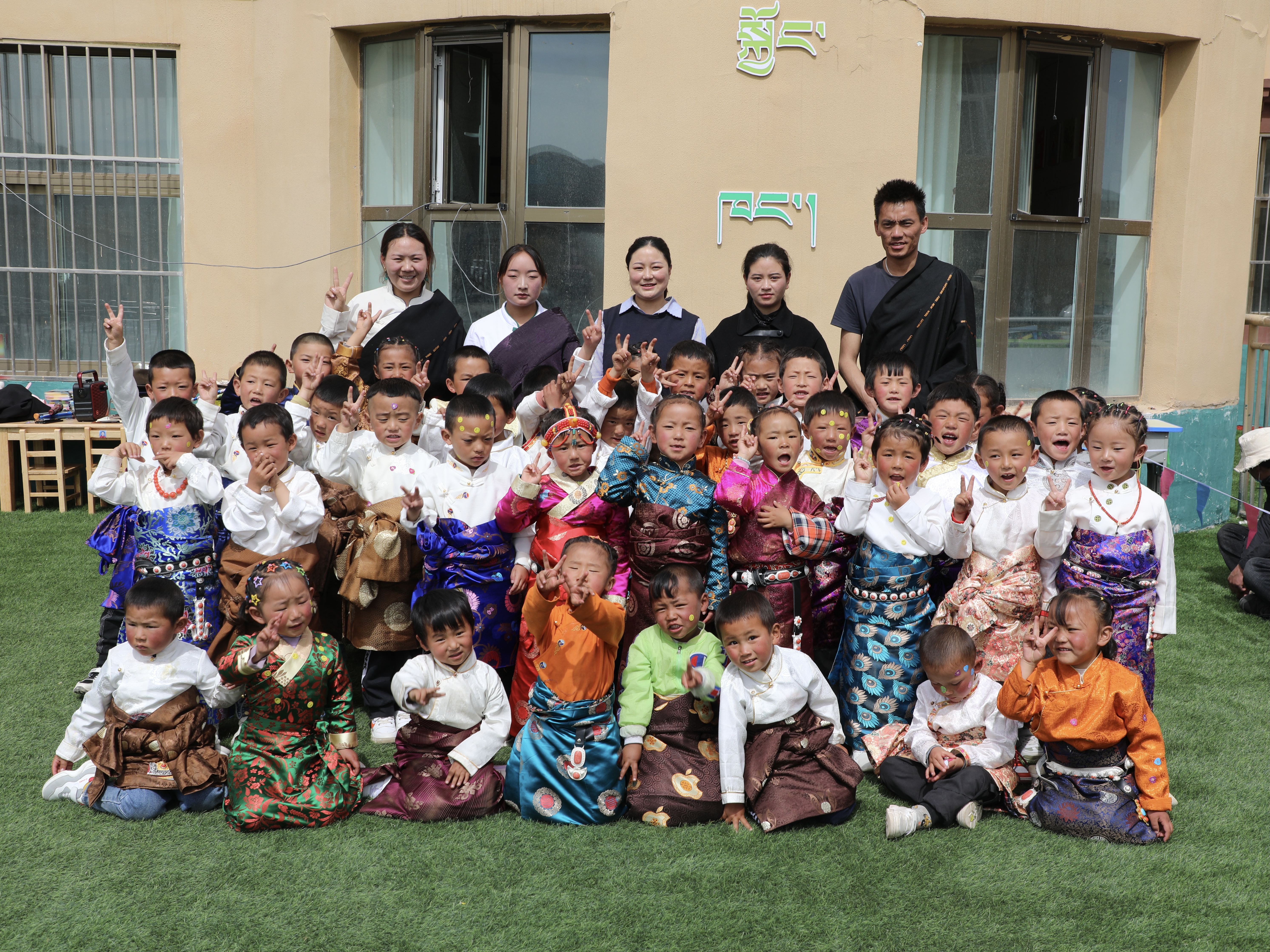 穿上藏袍唱歌舞蹈,6岁的扎西纳木甲第一次在幼儿园与38名同学一起过了“六一”儿童节。笑声从贡巴幼儿园传出,飘向校门外的青青草原。