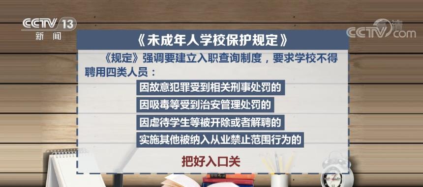 央视网消息:教职工是未成年人保护的重要主体,《未成年人学校保护规定》强调要建立入职查询制度,要求学校不得聘用因故意犯罪受到相关刑事处罚的、因吸毒等受到治安管理处罚的、因虐待学生等被开除或者解聘的及实施其他被纳入从业禁止范围行为的四类人员,以把好入口关。