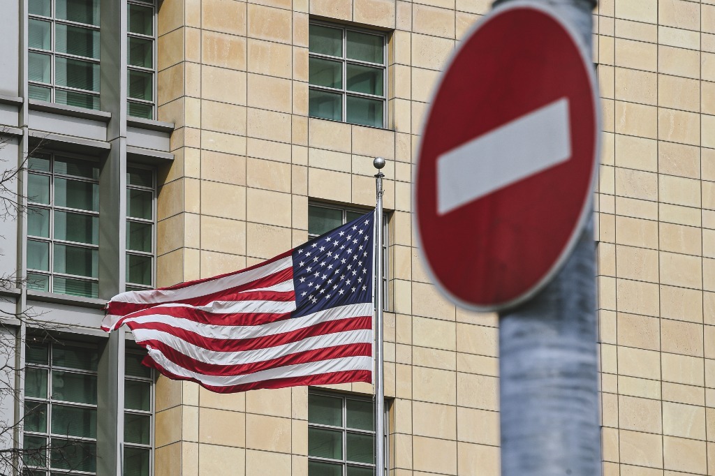 这是4月16日在俄罗斯首都莫斯科拍摄的美国驻俄罗斯大使馆。(新华社发,叶甫盖尼·西尼岑摄)
