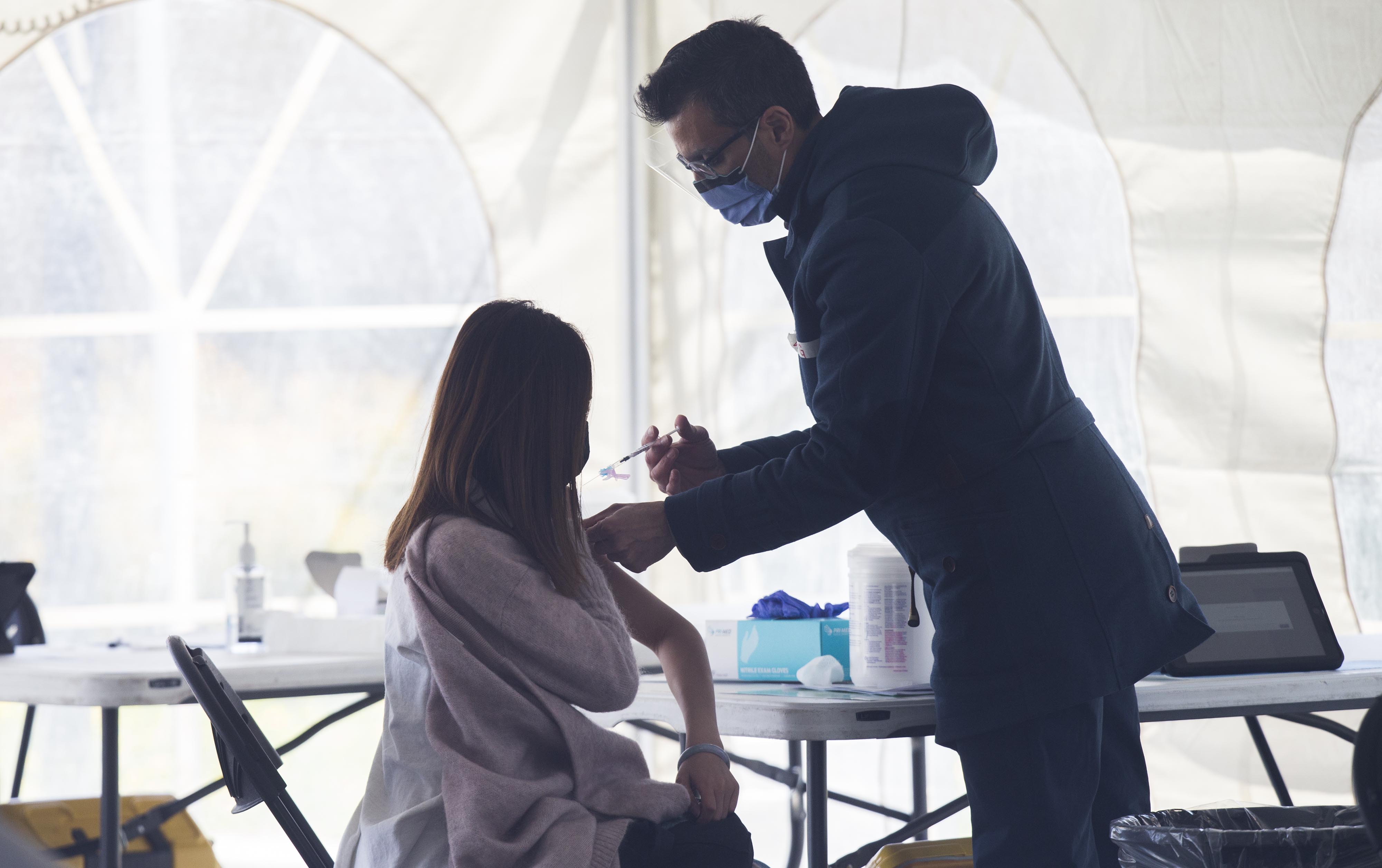 5月12日,医护人员在加拿大多伦多的一处临时疫苗接种点为一名女子接种新冠疫苗。新华社发(邹峥摄)