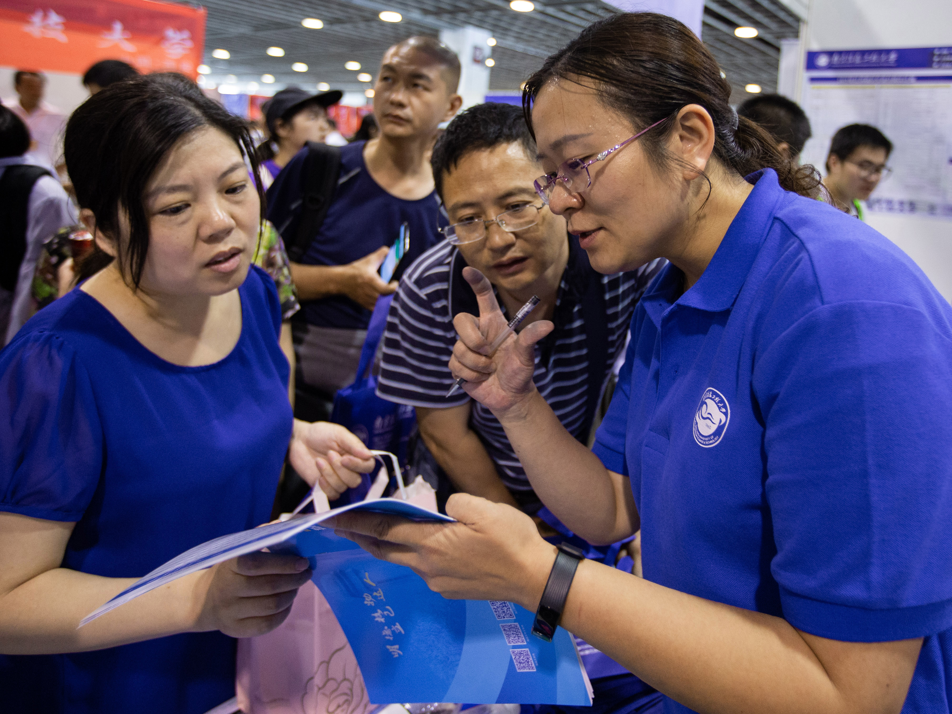 考生家长在咨询会上了解高校招生信息。新华社照片