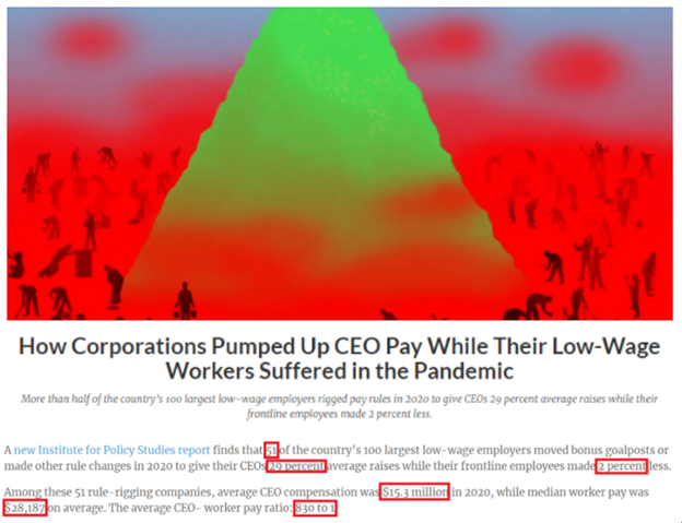 美国政策研究学会(IPS)近期调查发现,在疫情期间低收入工人失去收入、工作甚至生命的同时,美国许多顶级企业却一边以疫情为借口大举裁员,一边挖空心思为企业高管牟取不正当暴利。