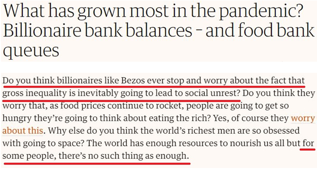 英国《卫报》日前以《疫情中增长最快的是什么?亿万富翁的存款和食物救济站前的长队》为题发文讥讽说,在美国这样的国家,一些人的灾难往往成为另一些人的发财机会。“你认为像(亚马逊老板)贝索斯这样的亿万富翁会停下手来担心严重的不平等将不可避免地导致社会动荡吗”,“对于有些人来说,没有够了的时候”。