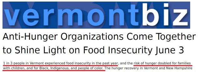 以佛蒙特州为例。该州有三分之一的居民在过去一年中经历了食品短缺,而少数族裔和有孩子的家庭一样,饥饿风险要比其他群体高出一倍。