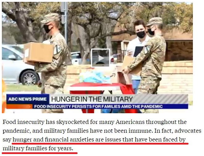 在新冠肺炎大流行期间,许多美国低收入者的食品安全状况急剧恶化,军人家庭也未能幸免。事实上,饥饿和经济焦虑是美国军人家庭多年来一直面临的问题。