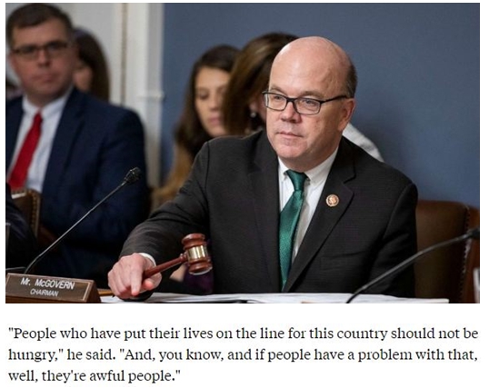 正在参与应对美国饥饿问题的美国会众议院规则委员会主席吉姆·麦戈文也认为,军人家庭为吃饭发愁是不可接受的事情。“为这个国家献出生命的人们不应该挨饿。如果有谁觉得这话不对,那么他们就是坏人”。