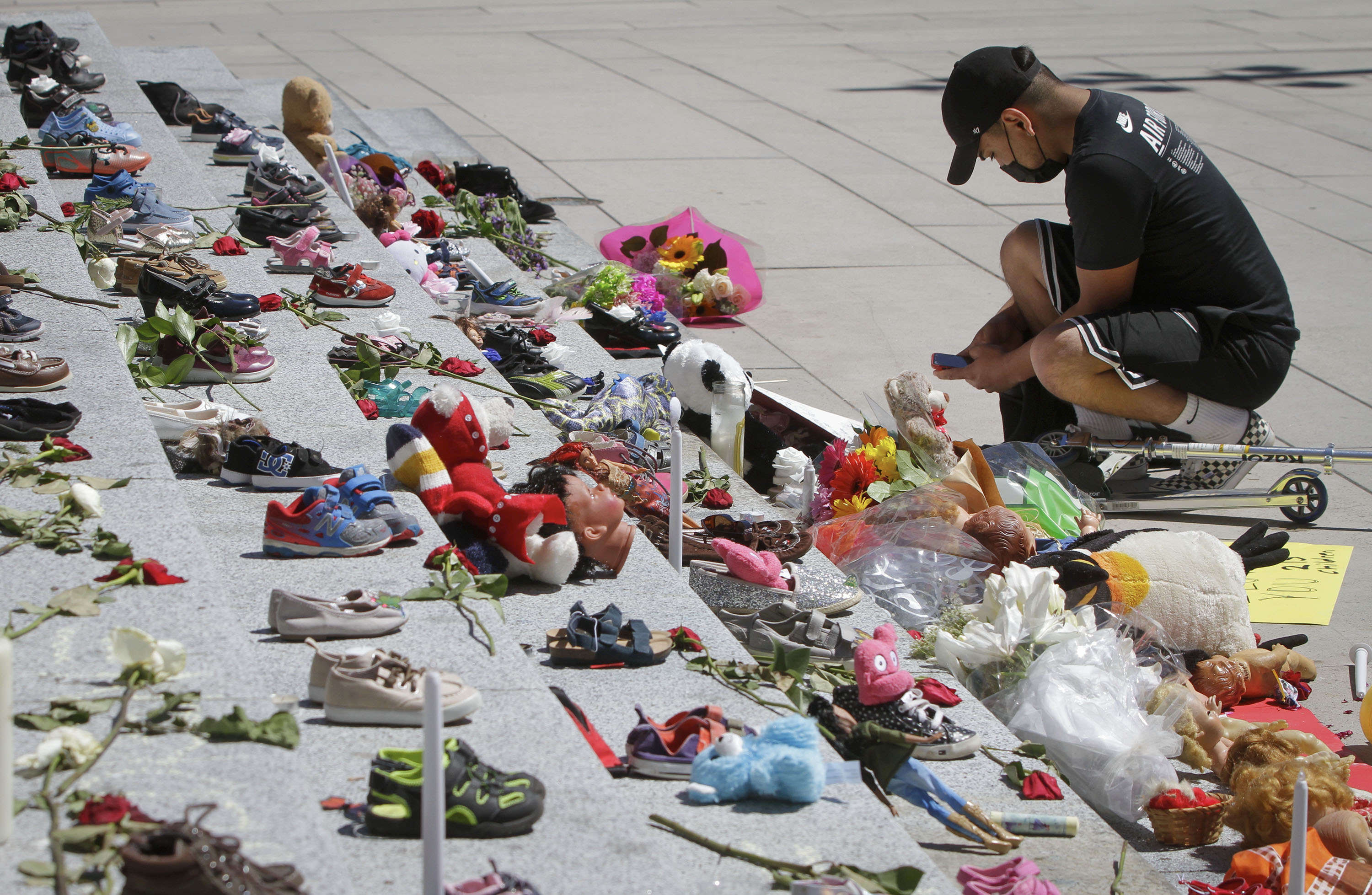 这一事件震动加拿大全国,多地民众自发举行了悼念活动。在不少活动现场,鲜花与卡片中间摆放着215双童鞋或215件玩具,以纪念这些从未被登记在死亡者名单上的孩子。