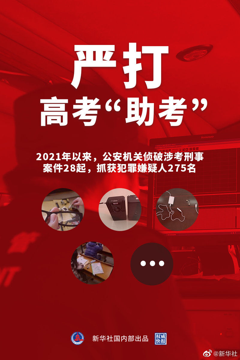 【权威快报丨公安机关严打高考助考违法犯罪活动】高考安全关系万千家庭,关系社会公平正义,与群众利益紧密相关。公安部3日召开新闻发布会介绍,2021年以来,公安机关侦破涉考刑事案件28起,抓获犯罪嫌疑人275名。涉案犯罪团伙大多利用互联网招揽考生使用无线器材实施作弊。在国家教育考试中组织考生作弊,向考生提供试题、答案,代替考试,出售、使用无线作弊器材等行为,均涉嫌犯罪,公安机关将依法严厉打击。同时,公安机关提醒广大考生及家长提高防范意识,切勿轻信网上各种“包过”“保过”“真题”的虚假信息,谨防上当受骗。(记者刘奕湛;海报设计杨轶群)