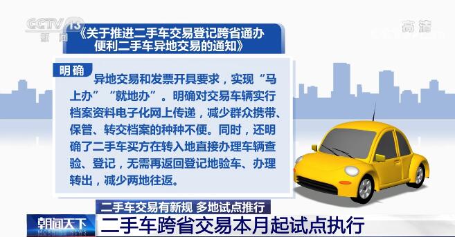 央视网消息:从6月1日起,由商务部会同公安部、税务总局联合出台《关于推进二手车交易登记跨省通办 便利二手车异地交易的通知》已在天津、太原等20个城市试点推行。