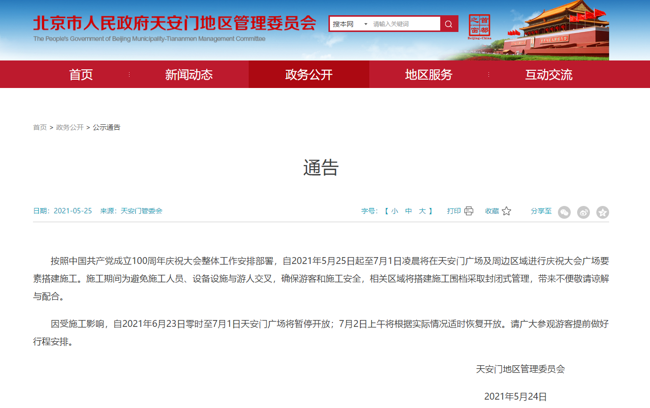 近日,天安门地区管理委员会发布通告:按照中国共产党成立100周年庆祝大会整体工作安排部署,自2021年5月25日起至7月1日凌晨将在天安门广场及周边区域进行庆祝大会广场要素搭建施工。施工期间为避免施工人员、设备设施与游人交叉,确保游客和施工安全,相关区域将搭建施工围挡采取封闭式管理,带来不便敬请谅解与配合。