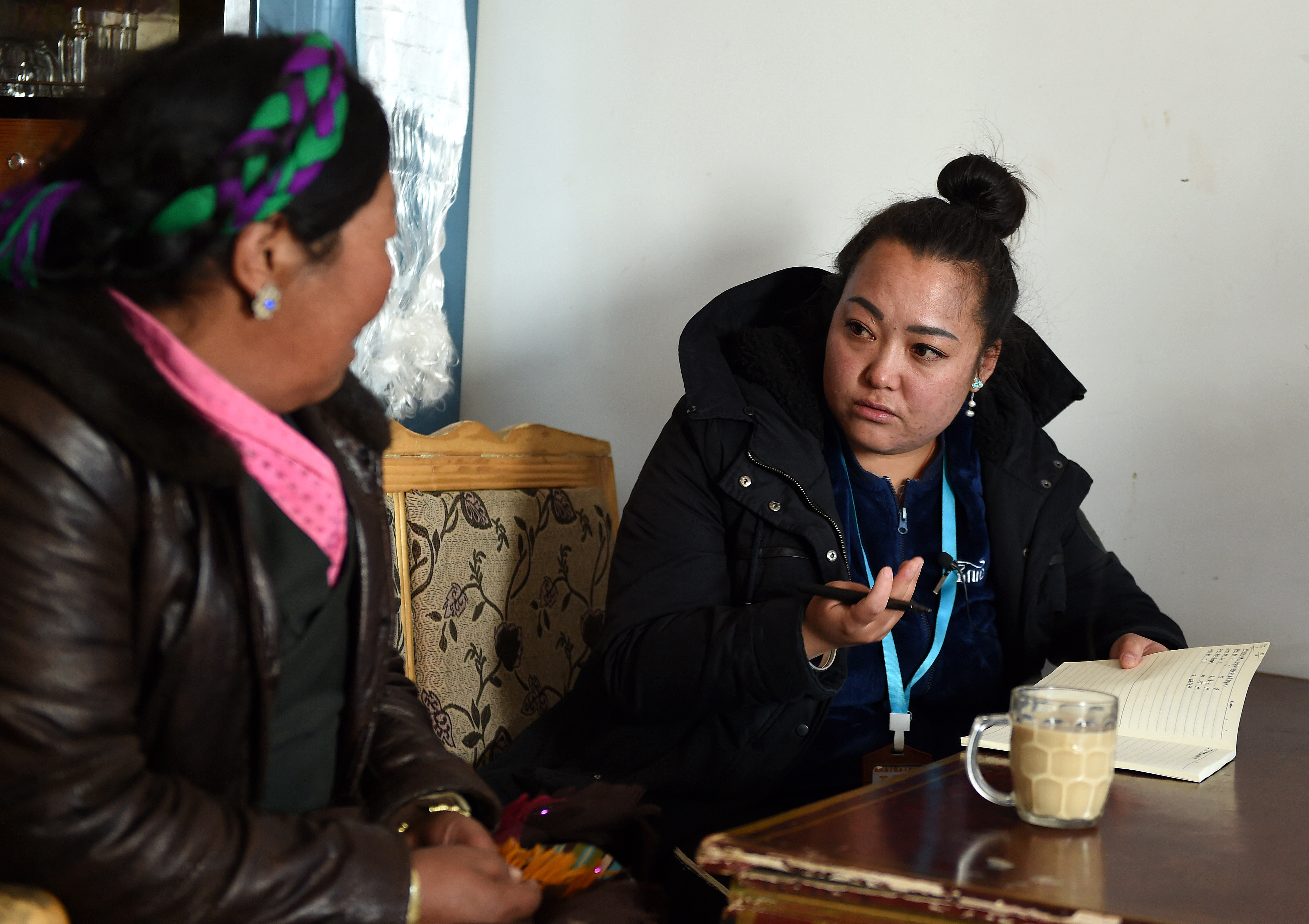 2018年3月6日,拉萨市曲水县委宣传部副部长、才纳乡四季吉祥村党支部第一书记索朗央吉(右)与村民商量编制规划。新华社记者觉果摄