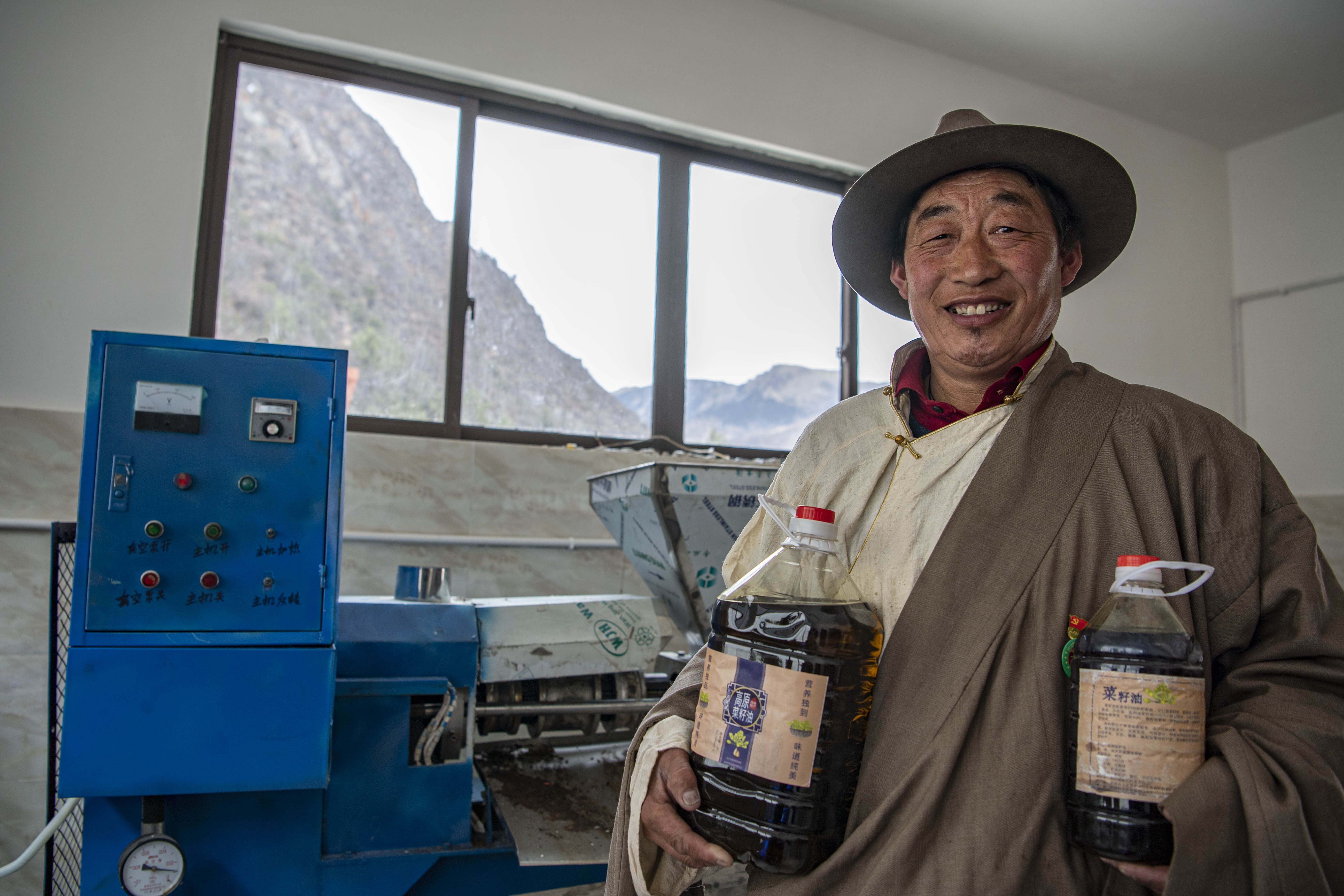 2021年3月23日,在昌都市江达县岗托镇岗托村的清油加工厂,永红在展示清油产品。新华社记者孙非摄