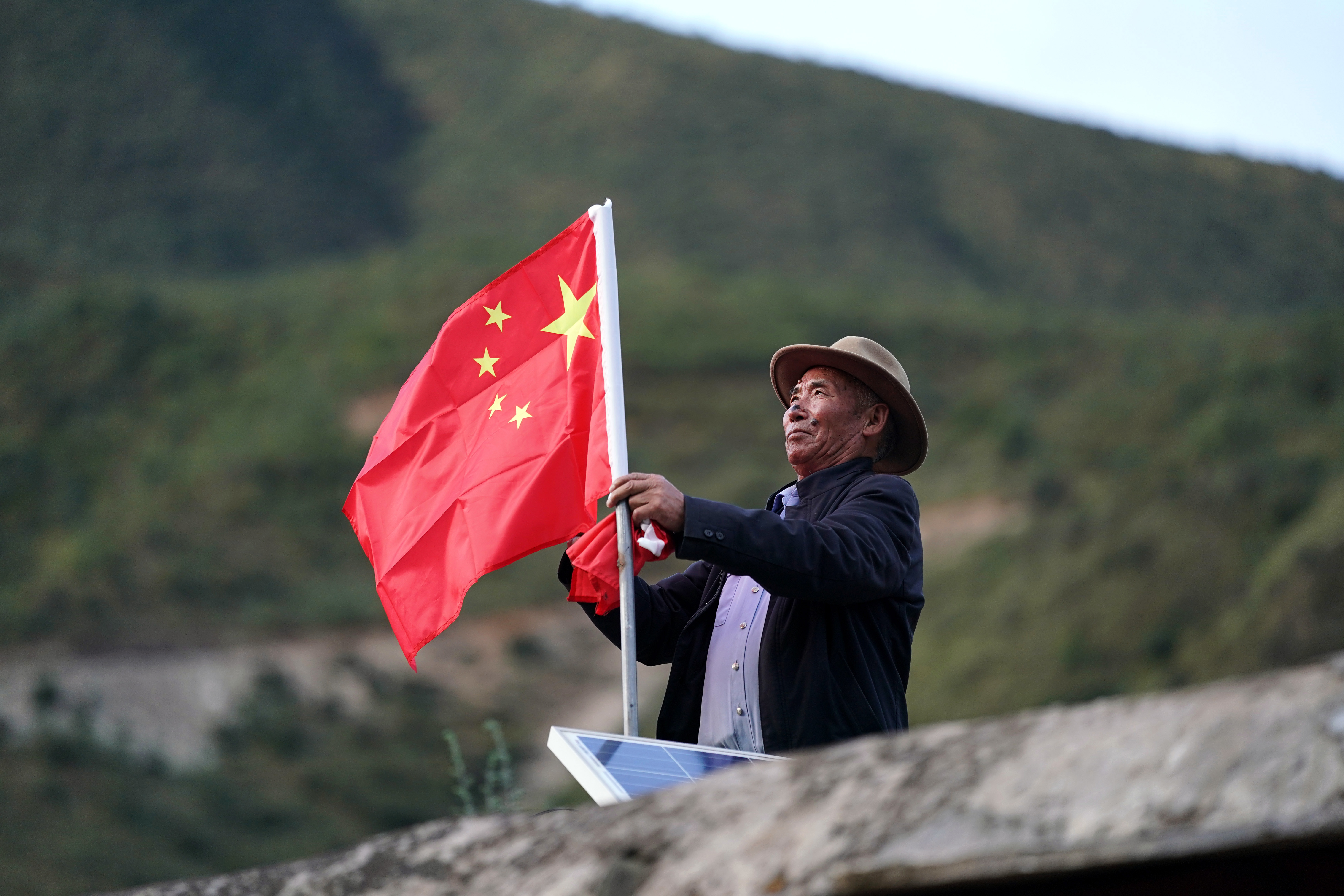 2020年9月25日,在西藏昌都市江达县岗托村,普巴在屋顶上换上崭新的国旗。新华社记者詹彦摄