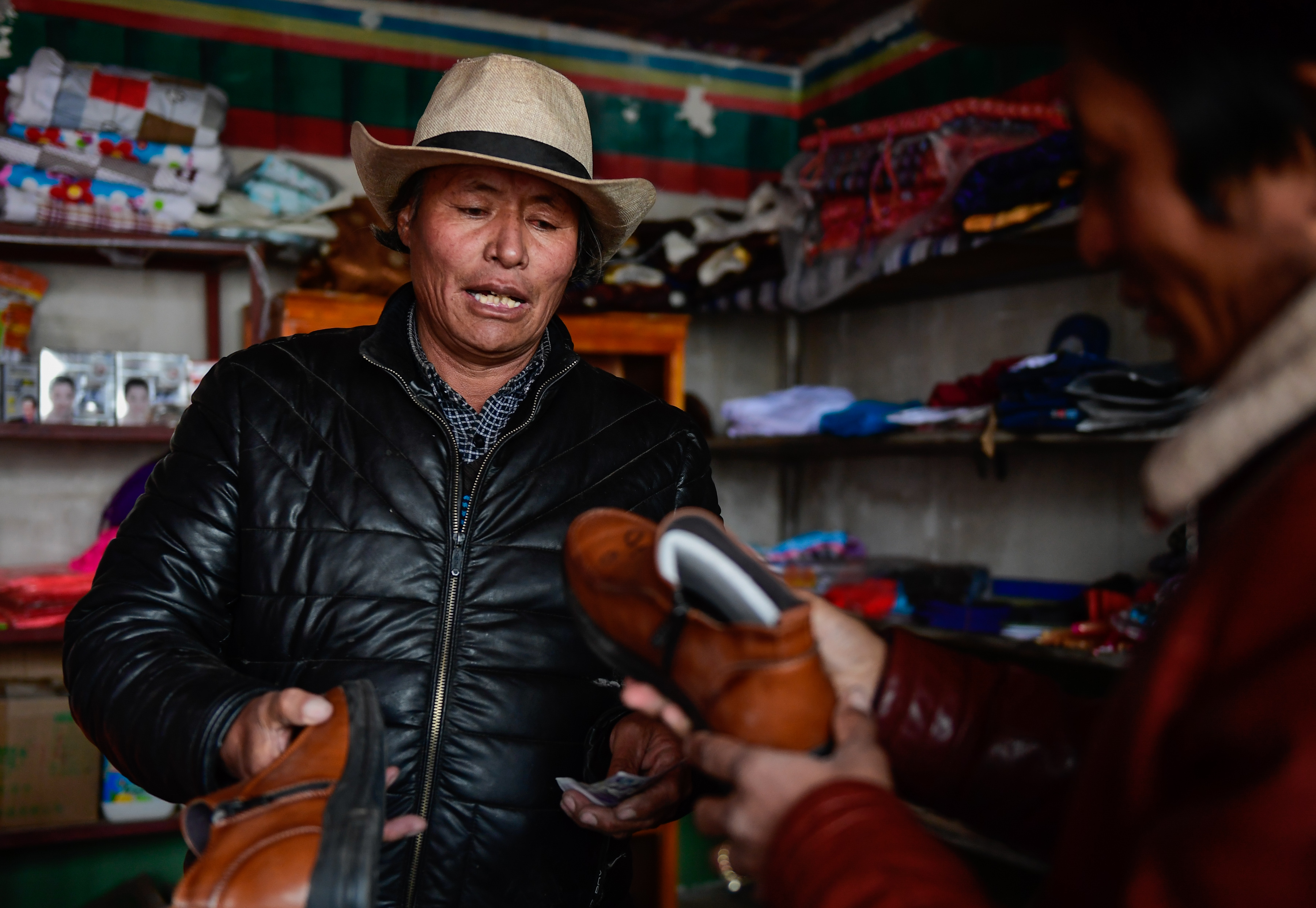 2018年3月15日,西藏阿里地区改则县物玛乡抢古村村民阿祖(左)在合作社商店内销售皮鞋。新华社发刘东君摄