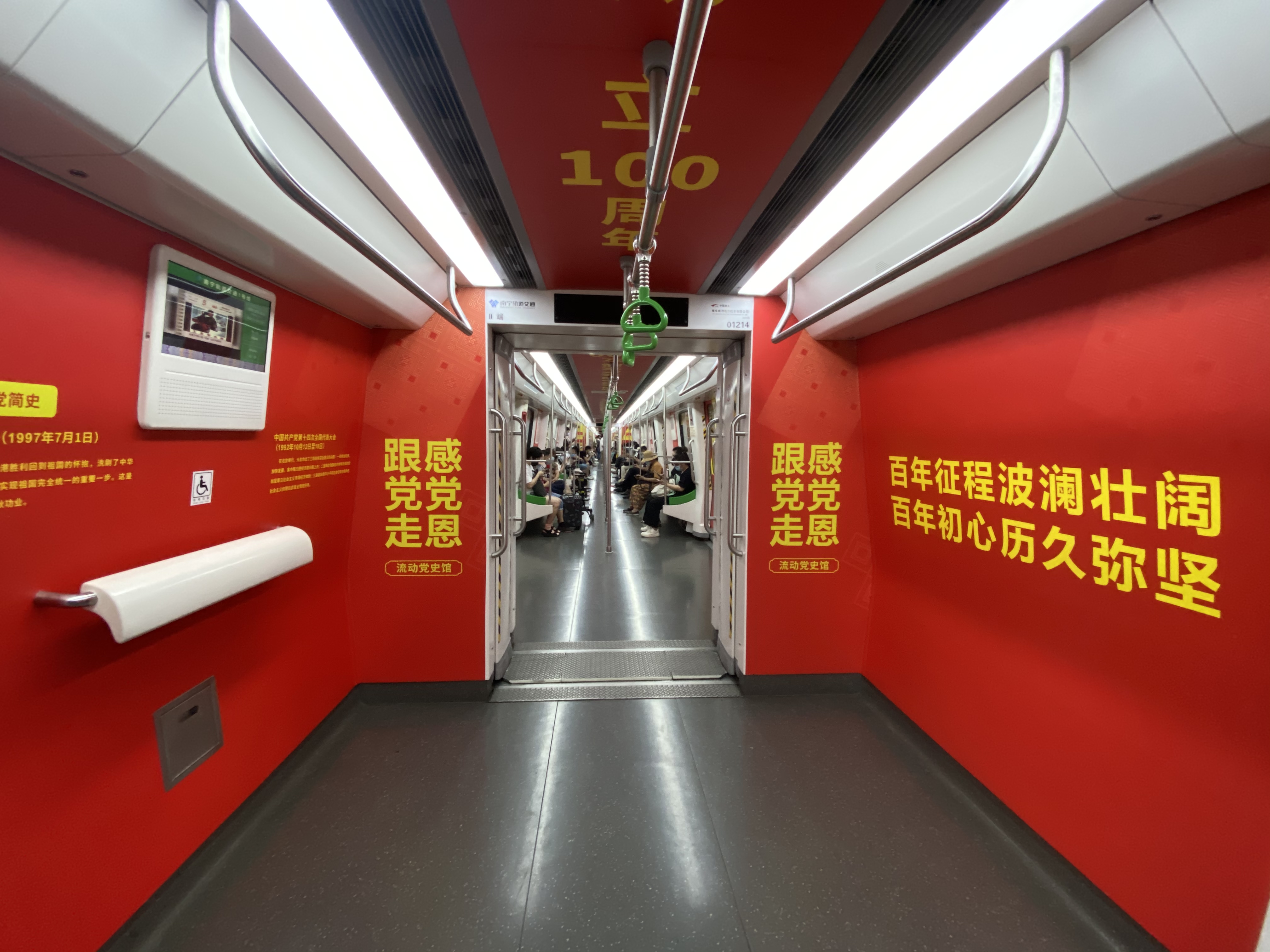 一趟“会宣讲”的地铁,每日穿梭在“绿城”南宁。车厢以“中国红”为主色调,车载电视循环播放党史宣传片,车厢内贴满红色标语和党史知识,以及随处可见的“党史知识大家答”二维码,带着乘客驶进百年党史的“时空隧道”。